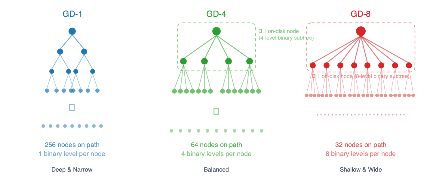 Think of it like a zip code: GD-1 reads your address one digit at a time (256 steps), while GD-8 reads 8 digits at once (32 steps). Fewer steps means fewer disk reads – but each “bundled node” is larger and more expensive to update, because the binary subtree inside it must be rehashed.