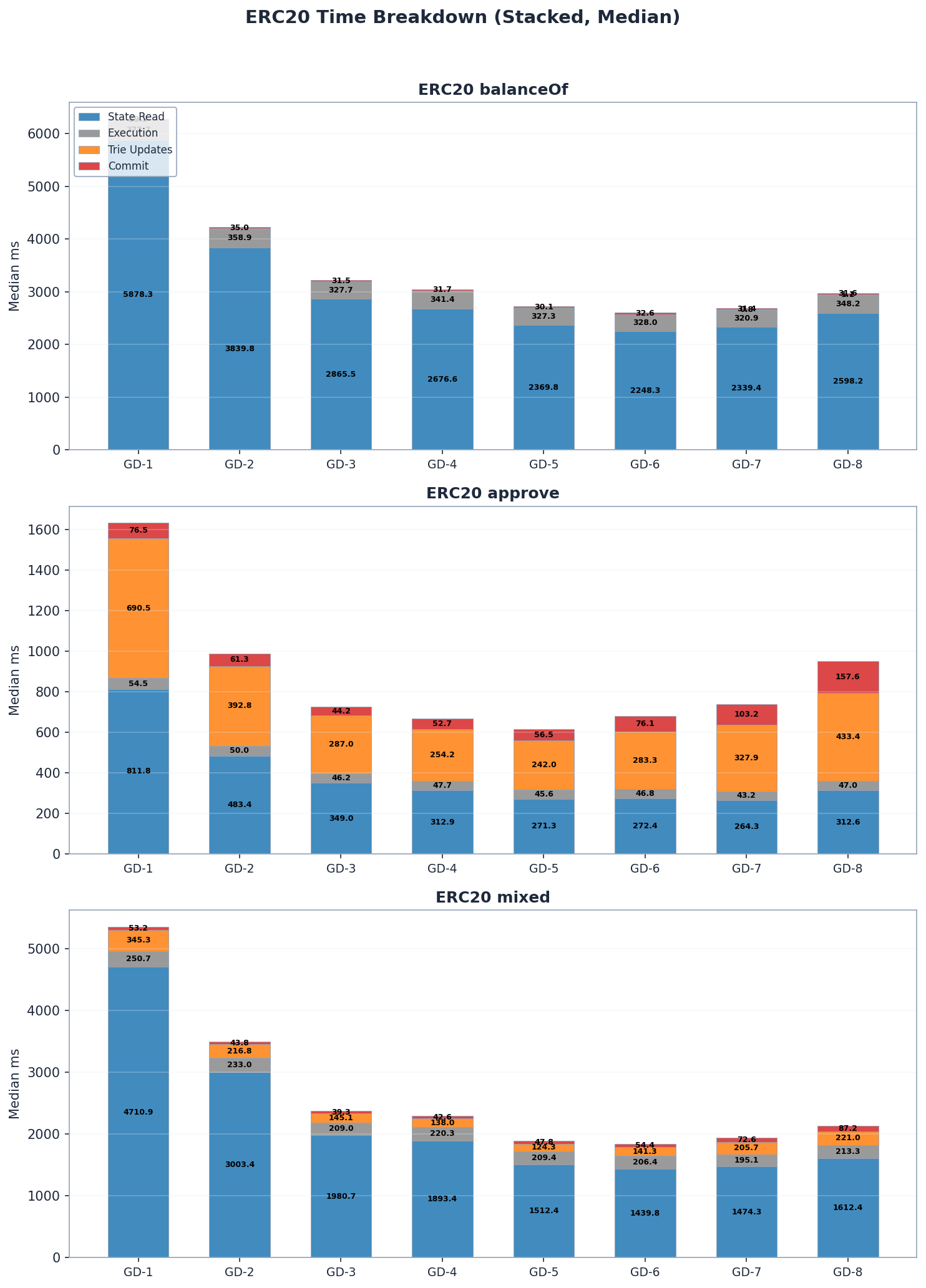 State reads dominate ERC20 block processing time across all group-depth configurations, accounting for 50–85% of total time. Trie update and commit costs are negligible for read-only benchmarks (balanceOf) but become the dominant cost component for writes (approve) – especially at higher group depths where internal subtree rehashing is most expensive.