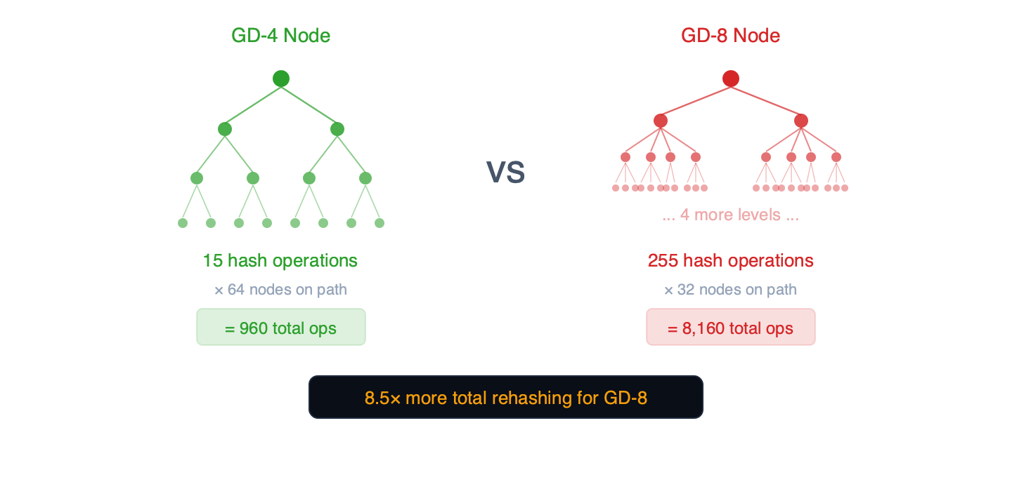 Note: The 17× ratio (255 vs 15 internal hash operations) is the theoretical upper bound from the data structure. Our benchmarks support the mechanism: GD-8 trie update costs are 1.71× more than GD-4 (433ms vs 254ms), consistent with random writes modifying a fraction of each node’s internal subtree. The geth implementation is the authoritative source for the exact rehashing algorithm.
