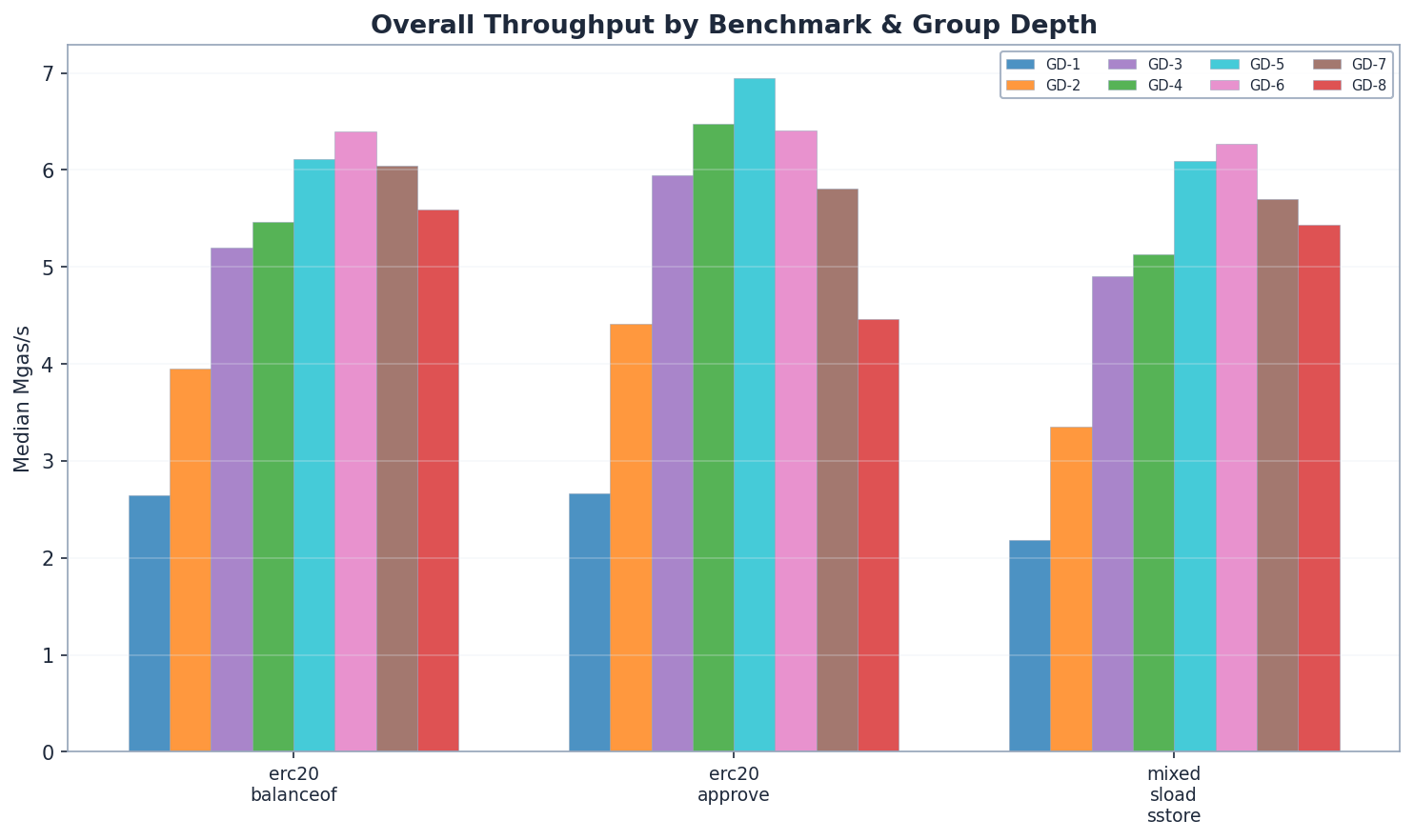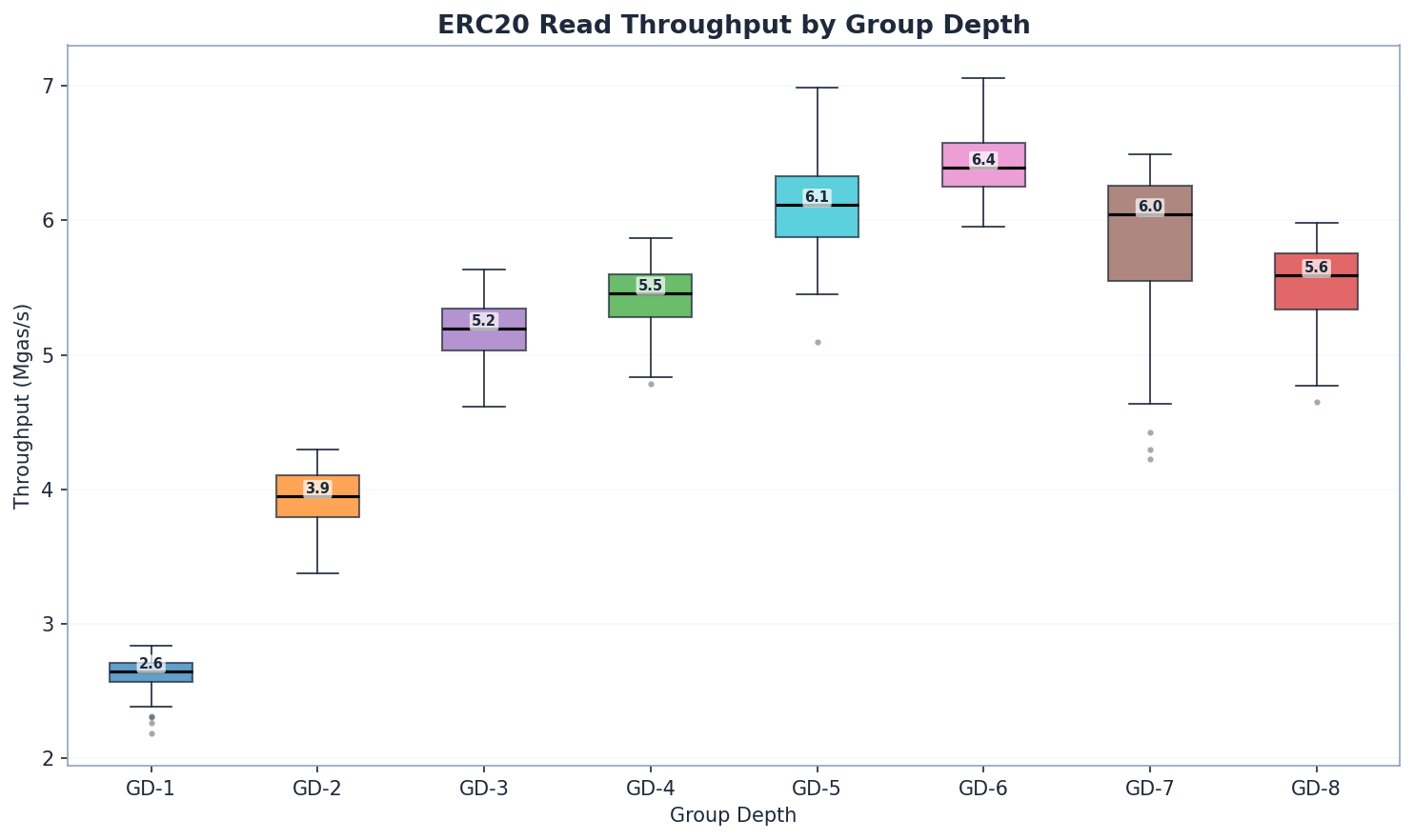 ~2.4x read throughput from GD-1 to GD-6. GD-6 achieves the highest read throughput (6.39 Mgas/s), followed by GD-5 (6.11) and GD-7 (6.04). Read performance increases monotonically from GD-1 through GD-6 before tapering off – GD-4 (5.46) beats GD-3 (5.20) as expected from shorter paths. GD-7 and GD-8 show diminishing returns as nodes become large enough to offset the shorter paths.