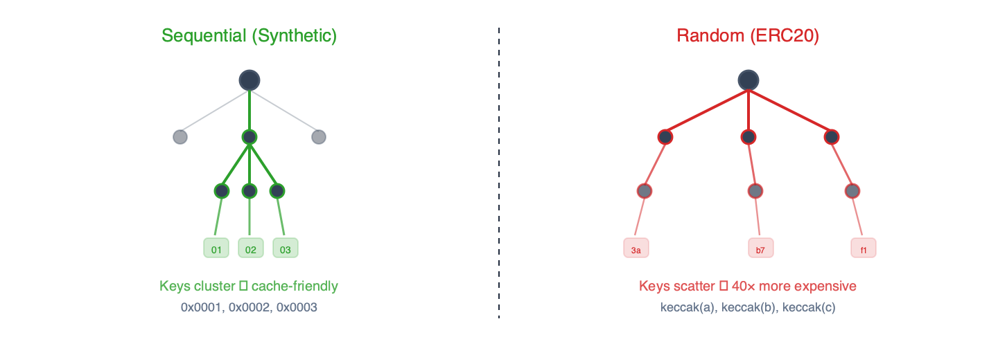Figure 2 – Sequential keys share trie prefixes and benefit from caching. Keccak-hashed keys scatter uniformly, forcing cold reads at every level.