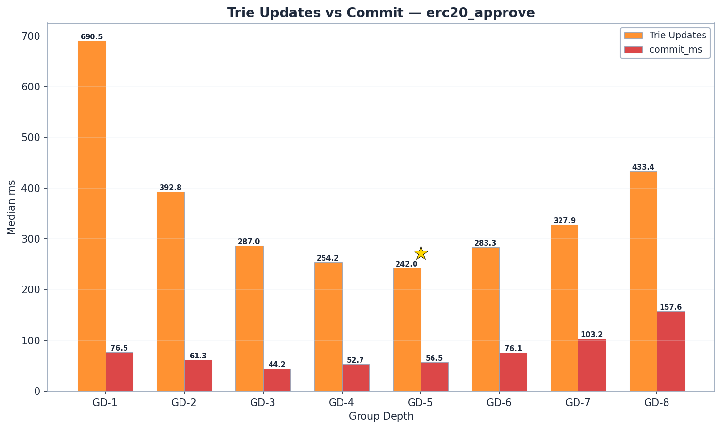 - Commit: GD-5 (57 ms) is slightly higher than GD-4 (53 ms). GD-6 (76 ms, +33% over GD-5) and GD-7 (103 ms) show moderate increases. The real commit cliff is at GD-8 (158 ms) due to ~8 KB nodes x 32 path nodes = ~256 KB serialization per write.