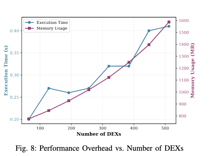 Even with hundreds of DEXs, MEVISOR stays comfortably below the VRAM limits of commodity GPUs and maintains low, predictable overhead.