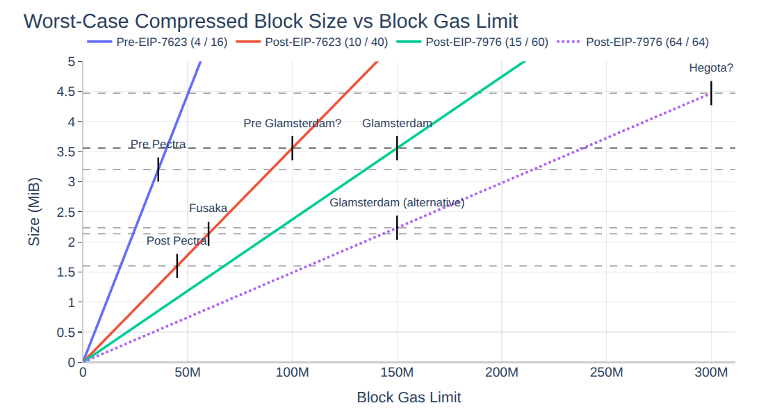With EIP-7976, as-is (15/60 for zero and non-zero bytes), we can get to a block gas limit of 150 million without exceeding a worst-case block size of 4 MiB. The alternative, arguably, the more aggressive repricing (64/64; no distinction between zero and non-zero bytes), would get us down to a worst-case block size of 2.25 MiB, leaving room for further gas limit increases toward 300 million in the future.